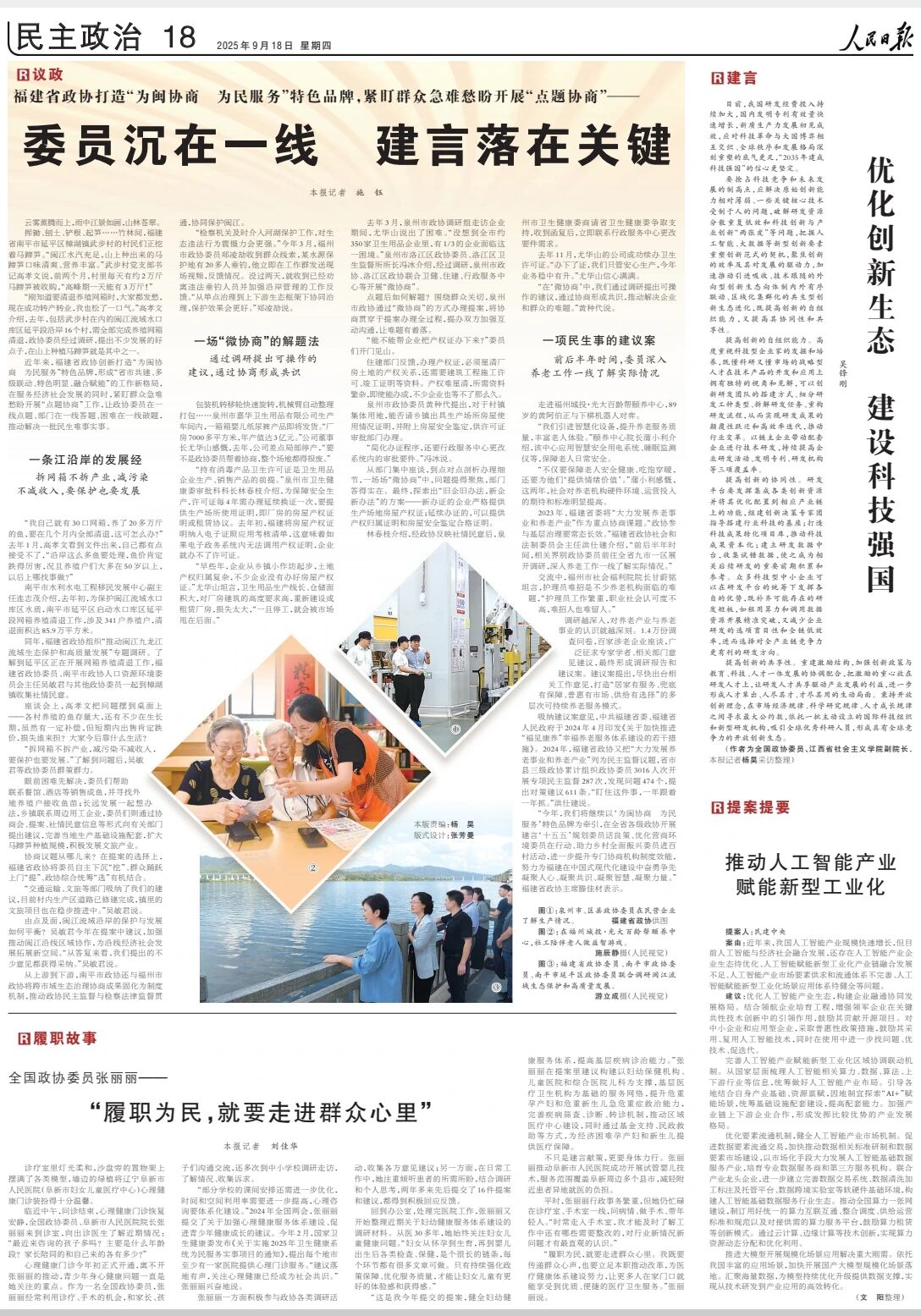 编者按: 9月18日,《人民日报》民主政治版头条刊发报道《福建省政协打造“为闽协商 为民服务”特色品牌,紧盯群众急难愁盼开展“点题协商”——委员沉在一线 建言落在关键》。十三届福建省政协深入贯彻习近平总书记关于加强和改进人民政协工作的重要思想,在创新打造“为闽协商 为民服务”特色品牌,服务经济社会发展的同时,积极打通政协委员联系群众、助力群众利益诉求解决的“最后一公里”,在履职中有力推动解决了一批民生难事实事,让人民政协制度优势有效转化为治理效能,为福建“奋勇争先、再上台阶”增添助力。