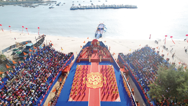 10月29日至31日,以“九九巡安 久久平安”为主题的纪念妈祖羽化升天1038周年系列活动在湄洲岛举行。 10月29日下午,纪念妈祖羽化升天1038周年大会暨海祭妈祖祈福大典,在湄洲岛下山村深澳底妈祖福船上举行。中国侨联原主席林兆枢宣布活动开幕,省人大常委会原副主任、中华妈祖文化交流协会名誉会长袁锦贵,省政协原副主席李祖可出席,市人大常委会主任苏永革等致辞,市政协主席沈萌芽主持。中华妈祖文化交流协会常务副会长俞建忠,湄洲妈祖祖庙董事会名誉董事长林金榜,湄洲妈祖祖庙董事会董事长林金赞,台湾妈祖联谊会会长、台湾大甲镇澜宫副董事长郑铭坤,湄洲妈祖祖庙董事会名誉董事长、台湾高雄狮甲慈明宫主委黄土城,湄洲妈祖祖庙董事会荣誉董事长、上海玉成天赐珠宝有限公司董事长赵柳成,台湾嘉义新港奉天宫董事长何达煌,印度尼西亚峇淡岛天后宫秘书长林晴良,台湾嘉义笨港港口宫主任委员陈庆堂,香港世界妈祖文化馆主席黄琼静,南美洲闽南同乡联谊总会常务副会长蚁金国,智利中华妈祖文化交流协会理事林伟立,台湾台南鹿耳门天后宫主委林瑞男,贤良港天后祖祠董事长林自弟等嘉宾出席活动。 来自智利、印度尼西亚、菲律宾、马来西亚、巴西、泰国、新加坡等7个国家,以及中国台湾、香港、澳门地区,北京、上海、海南、天津、海南、浙江、山西、广东、福建等地5000多名妈祖文化团体代表齐聚于此,共同祭拜妈祖。 本次活动期间,妈祖金身绕境巡安湄洲岛、纪念妈祖羽化升天1038周年大会暨海祭妈祖祈福大典、大瑄天作捐赠仪式、国画妈祖圣像捐赠仪式、平安塔灯光秀、烟花秀、莆仙戏公演等众多精彩活动内容。(时报记者 翁志鹏 林锦堂)